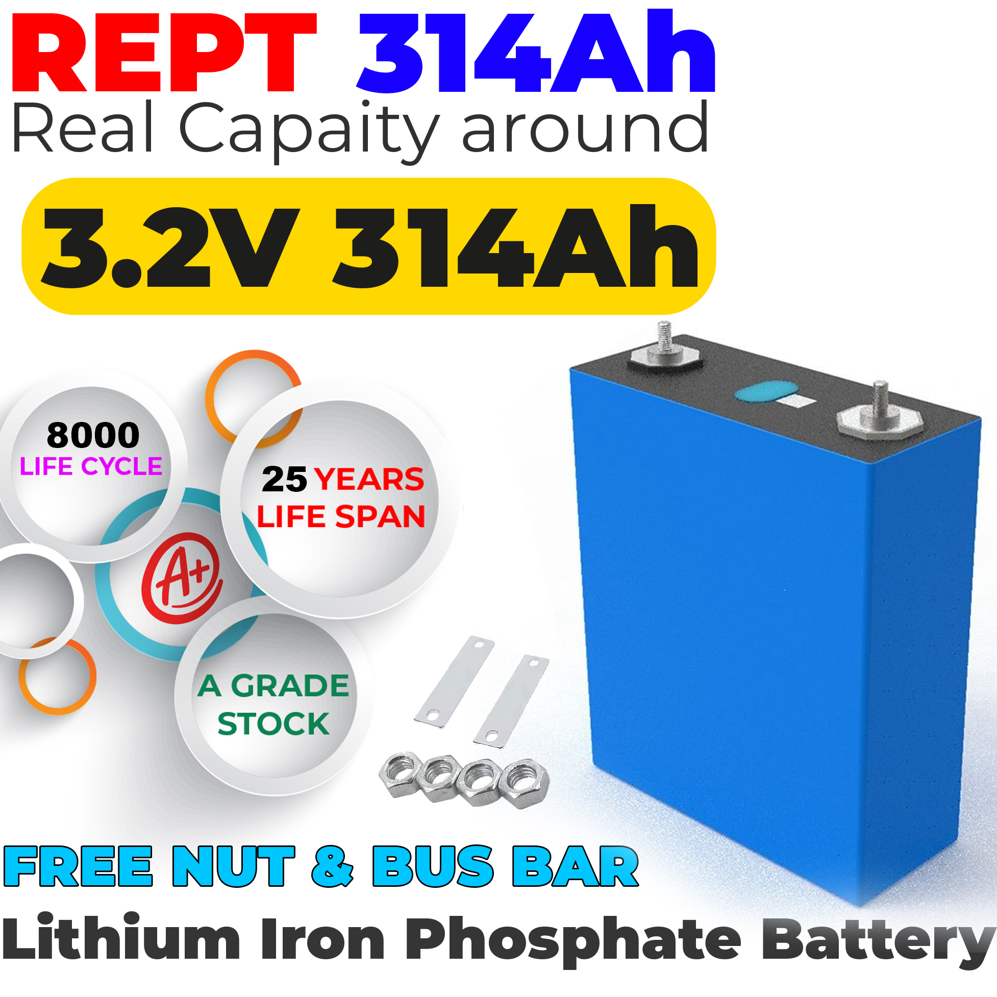 Brand New Lithium Iron Phosphate Cell For Electric BIKES Voltage – 3.2VAmpere – 314Ah Condition – Brand New Lithium offers several performance benefits versus its sealed lead acid (SLA) equivalent .A lifepo4 batteries capacity is independent from the discharge rate and provides constant power throughout it’s discharge. The degradation of a lifepo4 battery cells at a high temperature is significantly reduced in comparison to SLA. Lithium has ten times the cycle life as SLA at room temperature. Even at an elevated temperature, lithium still has increased cycle life.